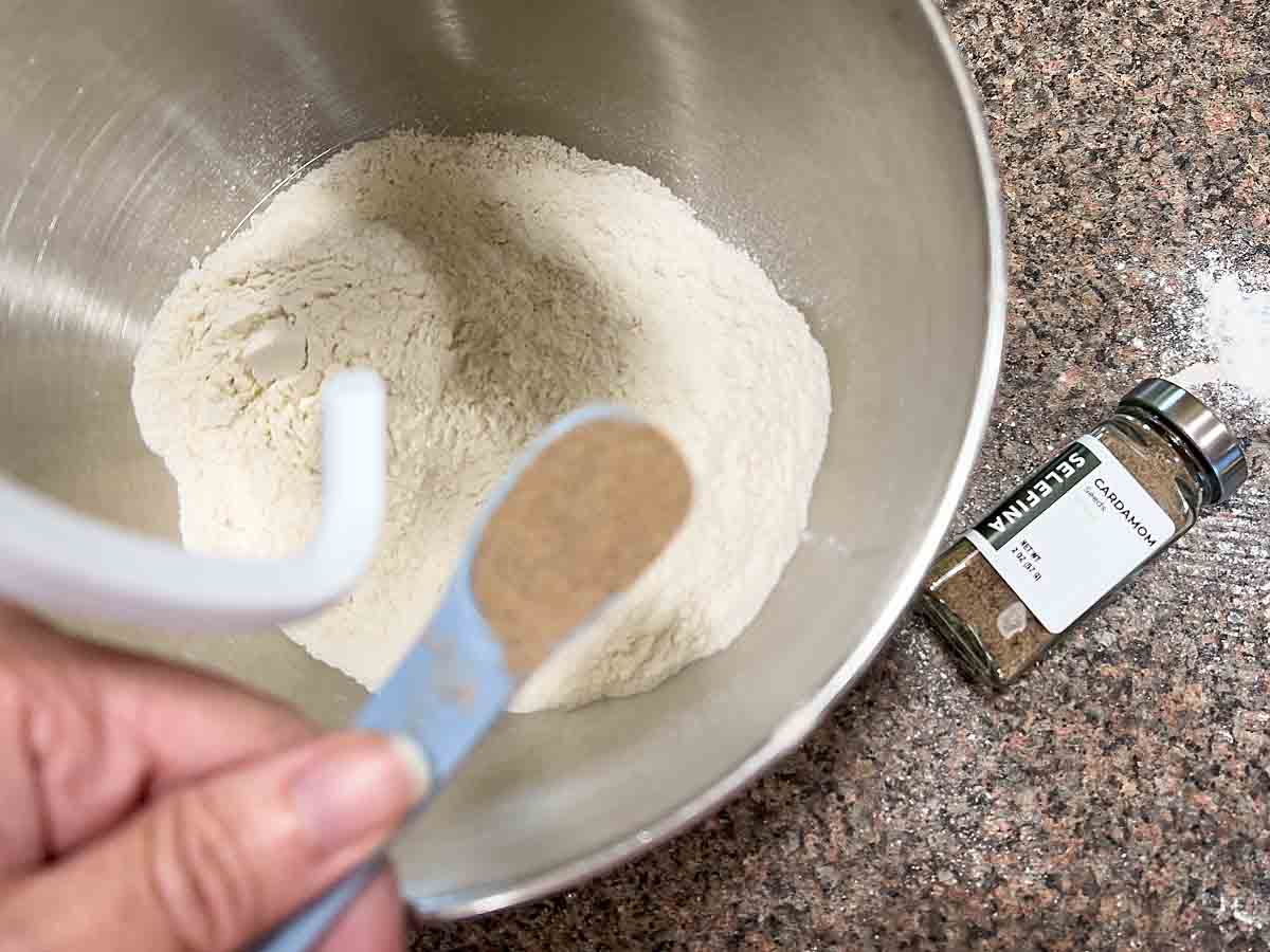 - In a large mixing bowl, mix the flour, salt and cardamom.